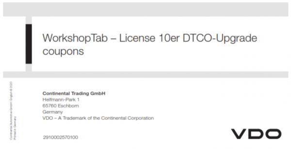 За да надстроите DTCO 4.0 до DTCO 4.0e, е необходим купон за надстройка, който съдържа 10 надстройки.